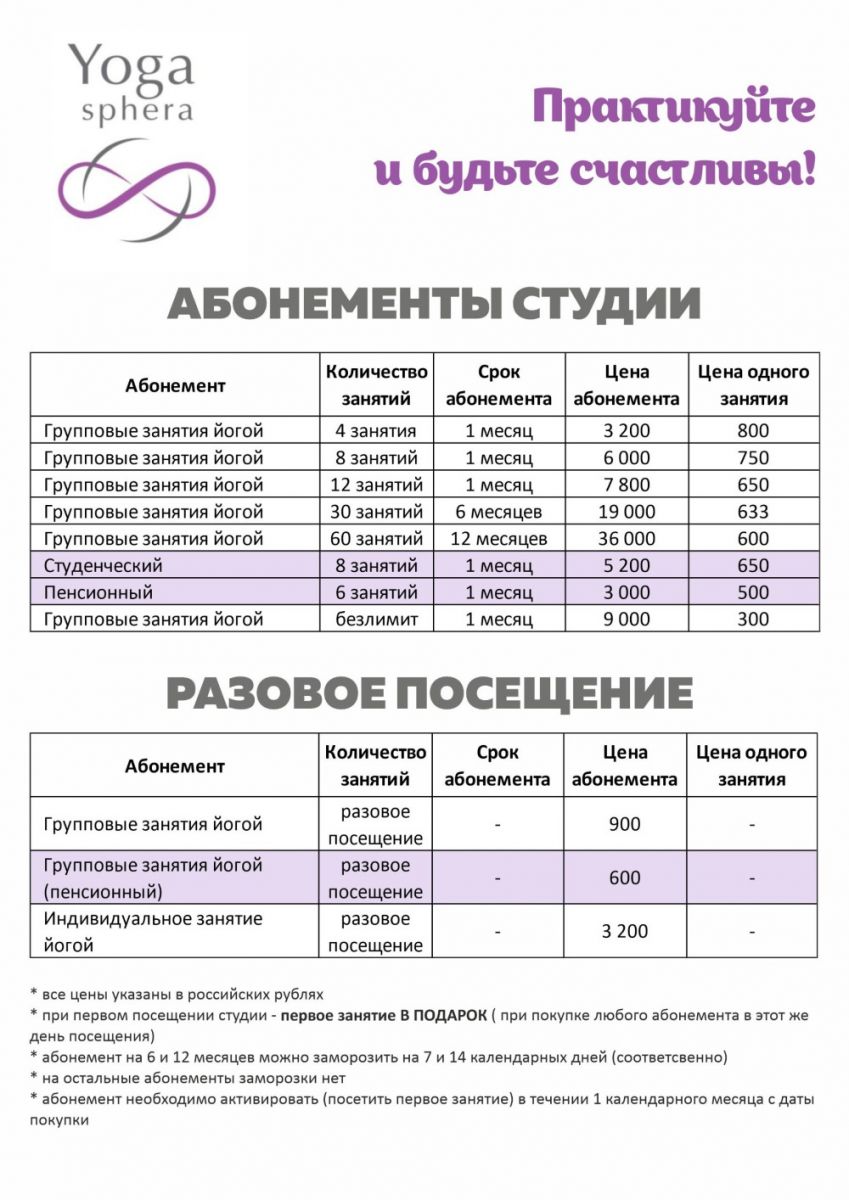 Цены студии YOGA SPHERA